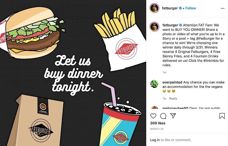 Fatburger a well known burger joint, encourages people to order more by offering prizes and meals to customers who tag them in their posts or stories.